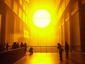Modern uses light, mirrors and haze to create an enormous sunrise.